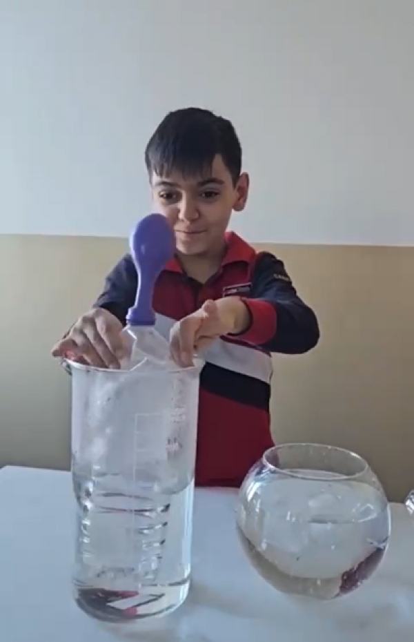 3C sınıfımızla laboratuvar dersimizde genleşme büzülme deneyini sıcak ve soğuk suyla gerçekleştirirken balonun hacminin artması ve azalmasıyla gözlemledik.