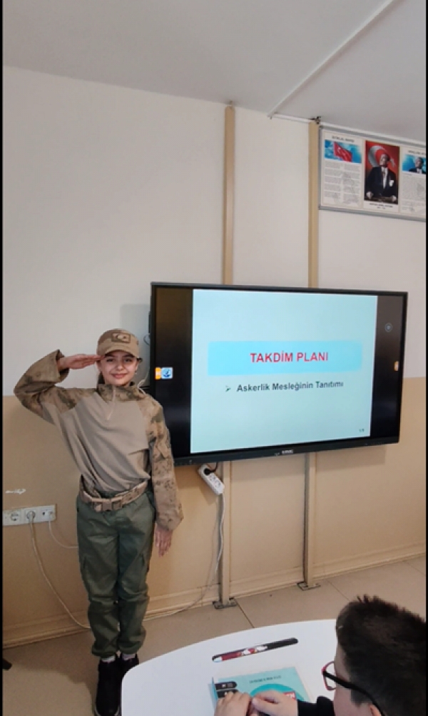 Meslekler sunumuna hodri meydan bir giriş! Askerlik mesleğini bize bu güzel kostümü ile tanıttığı için öğrencimize teşekkür ediyoruz.
